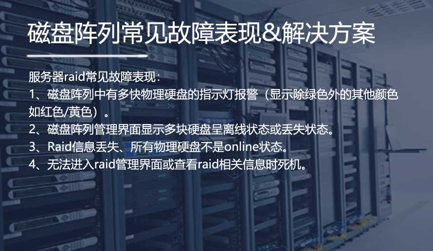 RAID5的空间利用率高、读出速度快、安全性高、不需要专门的校验码磁盘,而且解决了写入速度相对较慢的问题。尽管优点很多但还是会有出现故障的情况,当遇到RAID-5磁盘阵列的两块盘掉线,表现为两块硬盘亮黄灯应该怎么办呢?
