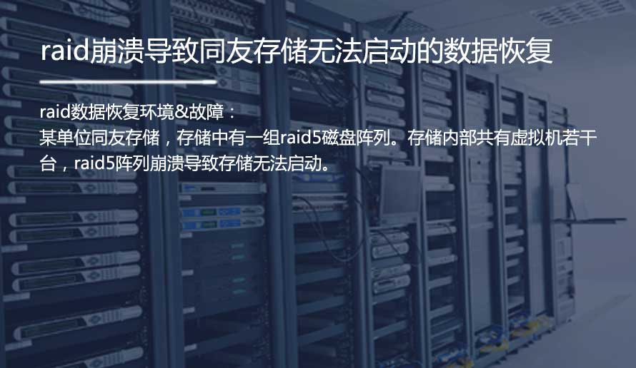 某单位同友存储,存储中有一组raid5磁盘阵列。存储内部共有虚拟机若干台,raid5阵列崩溃导致存储无法启动。