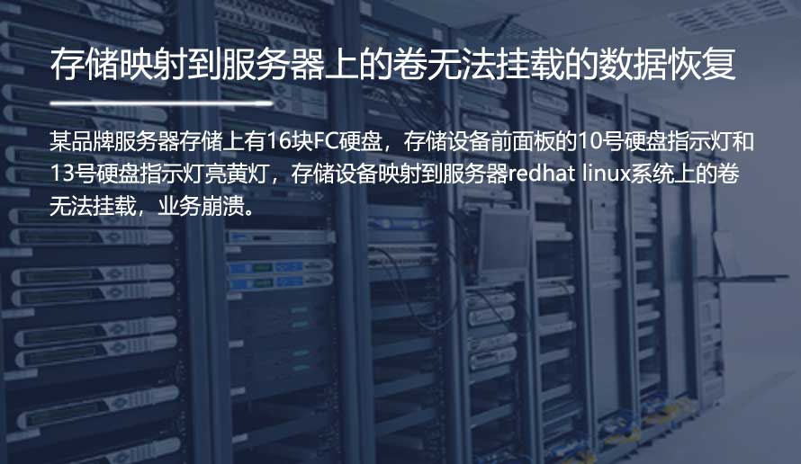 某品牌服务器存储上有16块FC硬盘,存储设备前面板的10号硬盘指示灯和13号硬盘指示灯亮黄灯,存储设备映射到服务器redhat linux系统上的卷无法挂载,业务中断。