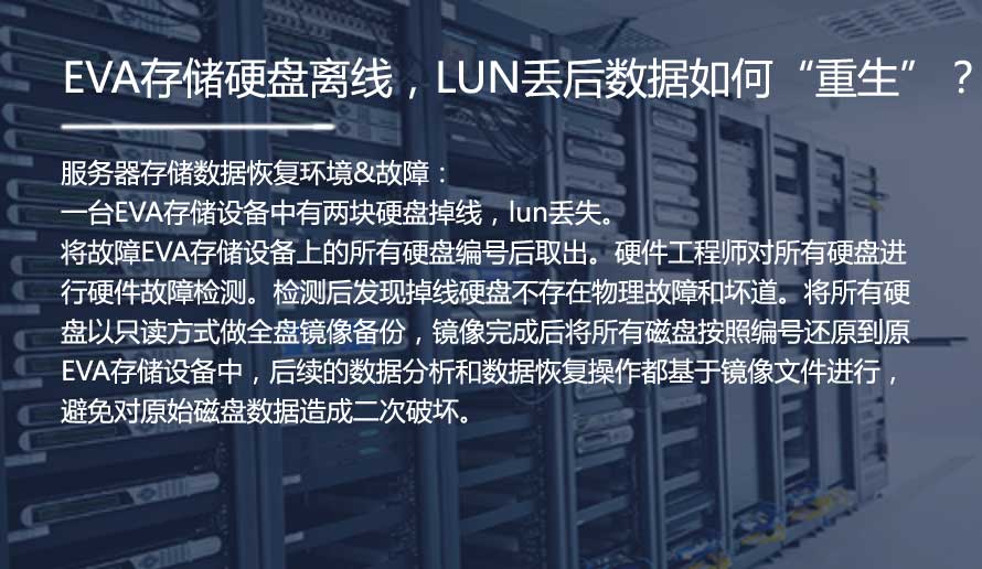 将故障EVA存储设备上的所有硬盘编号后取出。硬件工程师对所有硬盘进行硬件故障检测。检测后发现掉线硬盘不存在物理故障和坏道。将所有硬盘以只读方式做全盘镜像备份,镜像完成后