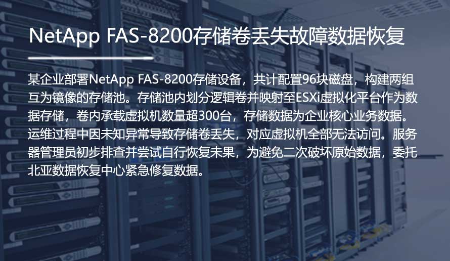 某企业部署NetApp FAS-8200存储设备,共计配置96块磁盘,构建两组互为镜像的存储池。存储池内划分逻辑卷并映射至ESXi虚拟化平台作为数据存储,卷内承载虚拟机数量超300台,存储数据为企业核心业务数据。运维过程