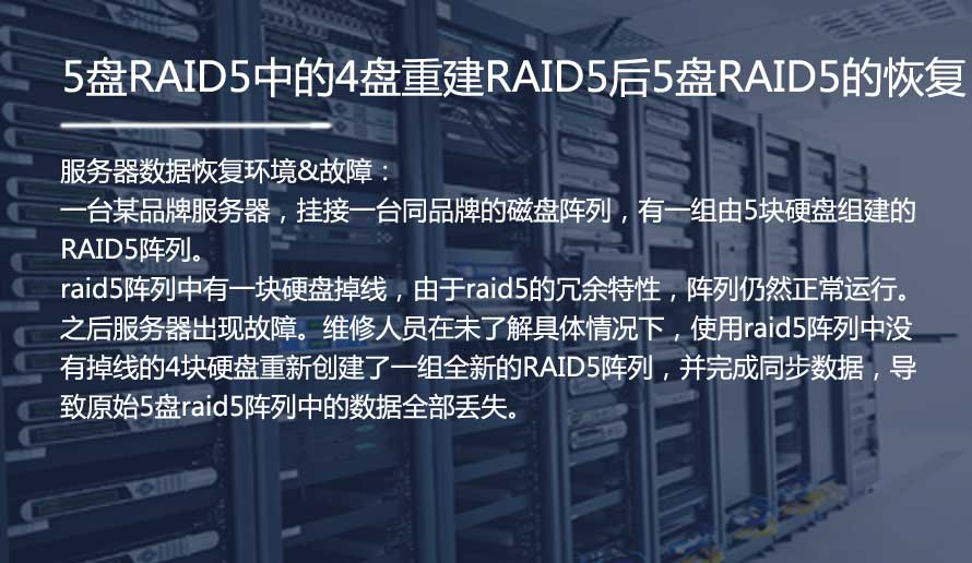 raid5阵列中有一块硬盘掉线,由于raid5的冗余特性,阵列仍然正常运行。之后服务器出现故障。维修人员在未了解具体情况下,使用rai