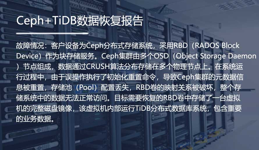 故障情况:客户设备为Ceph分布式存储系统,采用RBD(RADOS Block Device)作为块存储服务。Ceph集群由多个OSD(Object Storage Daemon)节点组成,数据通过CRUSH算法分布存储