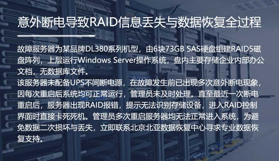 由于机房多次断电导致一台服务器中raid阵列信息丢失。该阵列中存放的是文档,上层安装的是Windows server操作系统,没有配置ups。