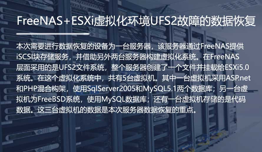 本次需要进行数据恢复的设备为一台服务器,该服务器通过FreeNAS提供iSCSI块存储服务,并借助另外两台服务器构建虚拟化系统。在FreeNAS层面采用的是UFS2文件系统,整个服务器创建了一个文件并挂载给ESXi5.0