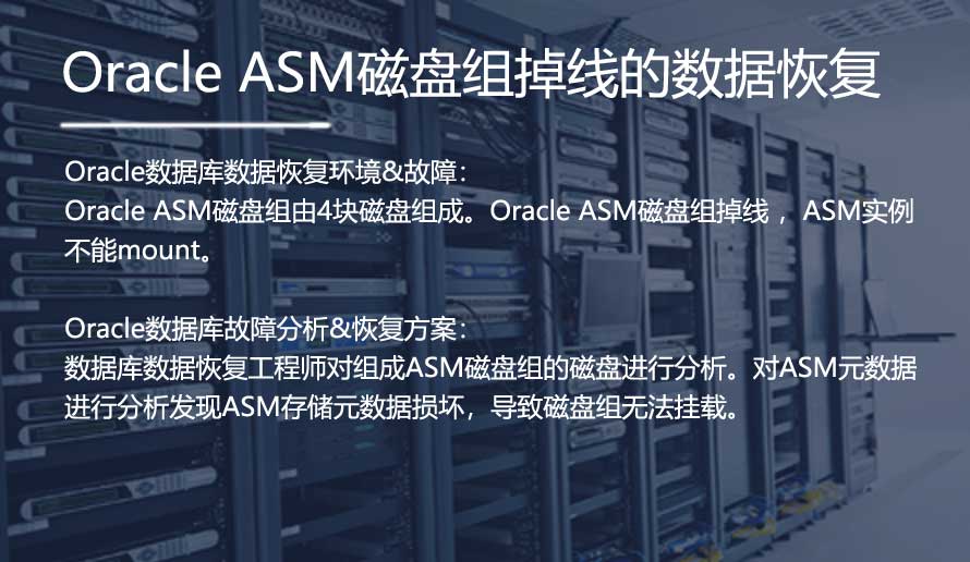 当遇到ASM磁盘组掉线 ,ASM实例不能mount应该怎么办?本次分享的案例是ASM磁盘组有4块磁盘组成,数据库和ASM软件为10.2.0.1,ASM磁盘组掉线 ,ASM实例不能mount,急需恢复里面的oracle数据