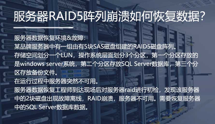 服务器raid5阵列中有2块硬盘掉线,上层服务器应用崩溃,导致服务器数据丢失。丢失的数据主要