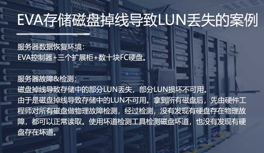 在这里小编分享一篇关于EVA存储故障恢复案例。整个服务器的存储结构是由一台控制器,三台扩展柜和28块FC 300G硬盘构成的。由于两块磁盘掉线导致存储某些LUN不可用,某些LUN丢失。由于服务器是因为某些磁盘掉线从而导致