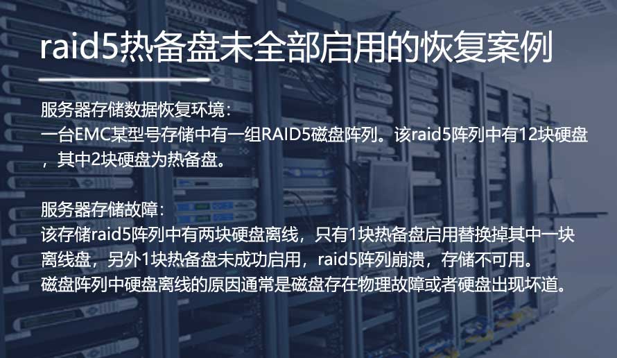 本次分享的案例为EMC 存储服务器由于硬盘出现故障离线瘫痪。服务器中共有10块硬盘,其中7块硬盘组成RAID 5磁盘阵列,另外3块硬盘为服务器在使用过程中的掉线磁盘。客户在处理掉线磁盘时只添加新的硬盘做rebuild,并