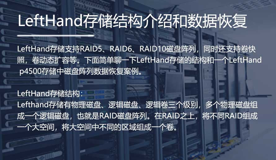 LeftHand存储支持RAID5、RAID6、RAID10磁盘阵列,同时还支持卷快照,卷动态扩容等。下面简单聊一下LeftHand存储的结构和一个LeftHand p4500存储中磁盘阵列数据恢复案例。
