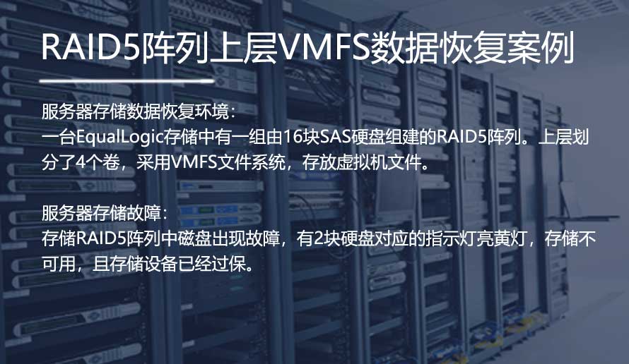 RAID5磁盘阵列,由于未知的原因导致存储忽然崩溃无法启动,RAID5阵列中的虚拟机全部丢失,其中3台虚拟机为重要数据,需要主要针对该3台虚拟机进行数据恢复。