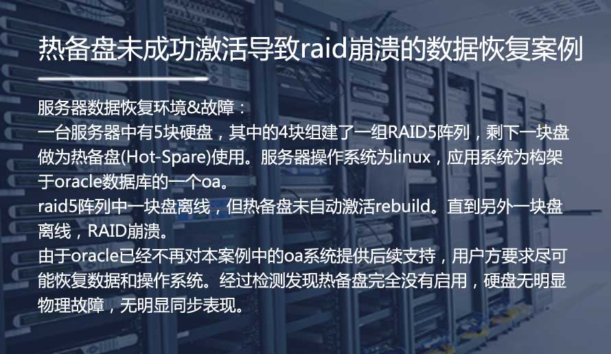 某单位的一台服务器中的raid5磁盘阵列有两块磁盘先后掉线,服务器崩溃。故障服务器的操作系统为linux,操作系统部署了oa,数据库为oracle。oracle数据库已经不再对该oa系统提供后续支持,用户要求尽可能恢复操