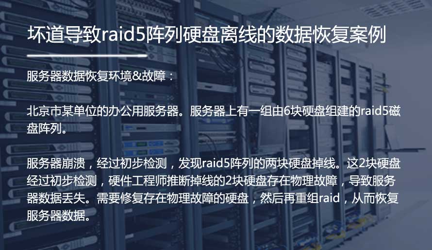 服务器未知原因崩溃,工作人员排查故障后发现服务器的raid5阵列中有两块硬盘离线导致该阵列不可用,服务器内的数据丢失。