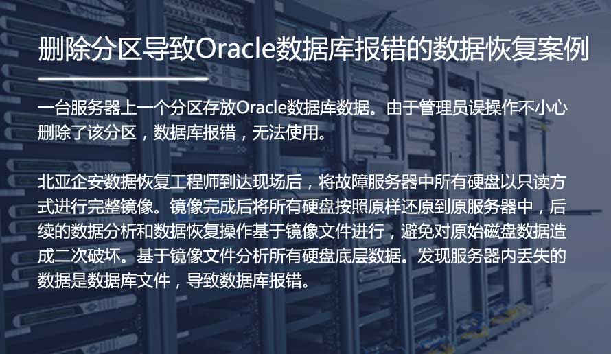 一台服务器上一个分区存放Oracle数据库数据。由于管理员误操作不小心删除了该分区,数据库报错,无法使用。